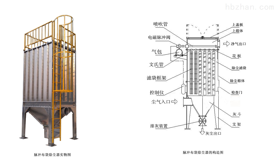 布袋式除塵器屬于環保設備的一種,作用是大氣污染治理,過濾粉塵廢氣。主要由上箱體(凈氣室)、中箱體(塵氣室)、灰斗、脈沖清灰系統、濾袋、濾袋骨架、進出風口、壓差計、檢修人孔、卸灰裝置、和pLc控制儀等組成。